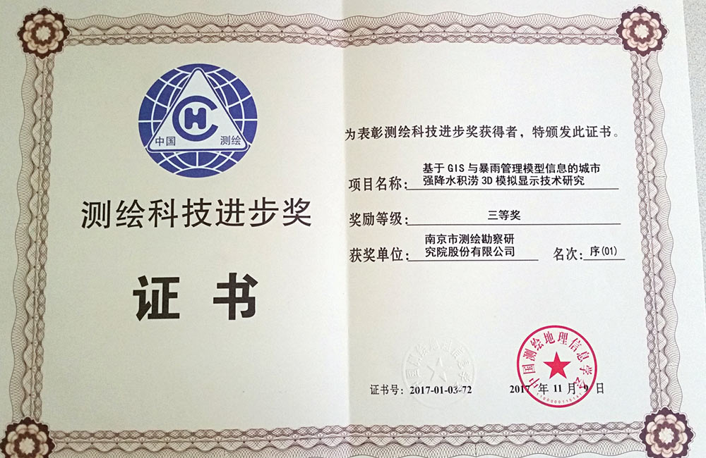 全國測繪科技進步三等獎——基于GIS與暴雨管理模型信息的城市強降水積澇3D模擬顯示技術(shù)研究