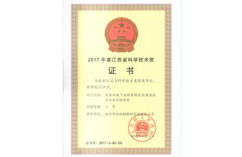 2017年度江蘇省科學技術(shù)三等獎——復雜環(huán)境下地鐵盾構(gòu)區(qū)間建造技術(shù)及其風險管控